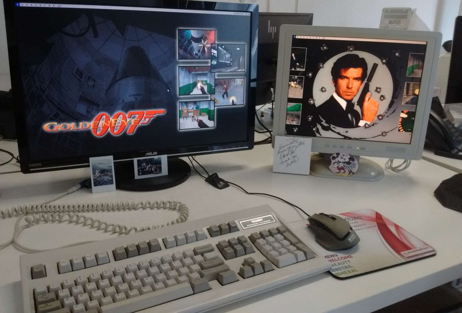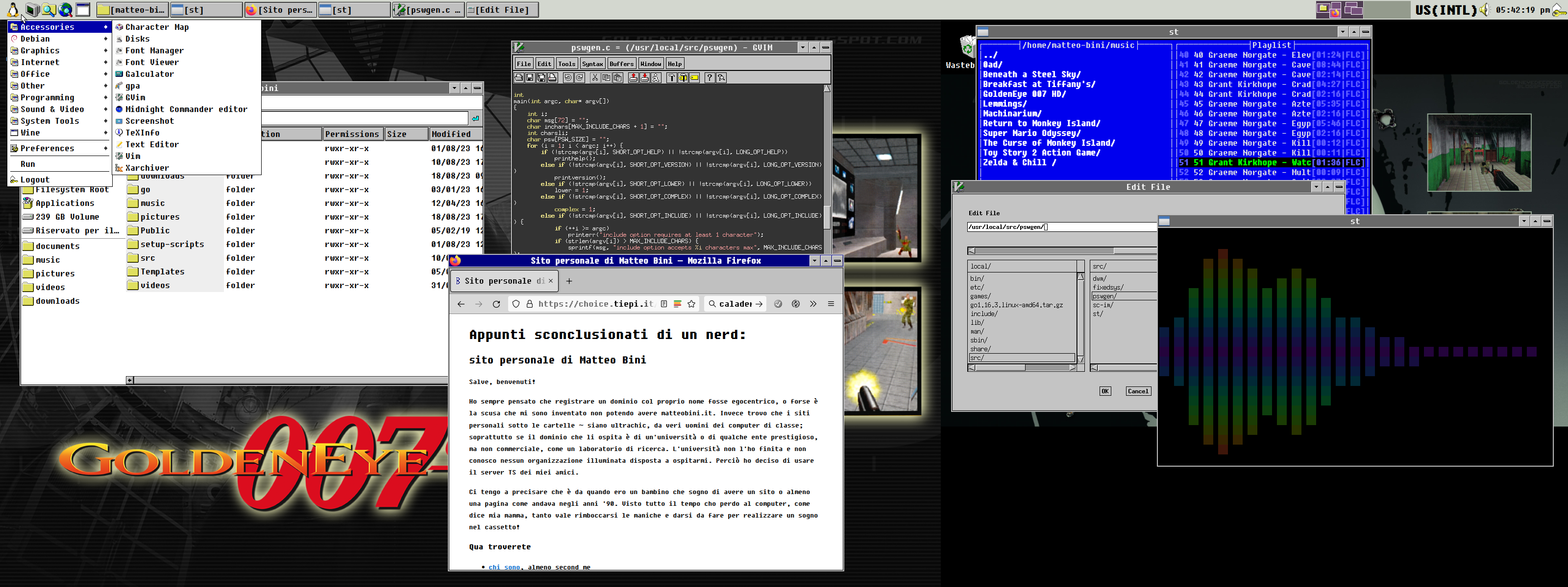 Con uno stile così non poteva mancare uno sfondo appropriato, anzi due, visto che nella postazione avevo due schermi. Scelsi di decorare il mio computer a tema GoldenEye 007 (1997) per il Nintendo 64. Un videogioco seminale per il genere degli sparatutto in prima persona e che senza dubbio caratterizzò la seconda metà degli anni '90. Uscì già oltre il periodo di Windows 3.1 (1992), ma in questo modo mi fa ridere ancora di più: è come se fosse il computer di un ragazzino fissato con quel videogioco, che però usa un sistema operativo appena datato, magari personalizzato con Calmira [15]. Che buffissimo universo parallelo sarebbe! Neanche tanto lontano dalla mia esperienza, visto che nel 2000 usavo Windows 3.1 su un 486 e giocavo a una versione modificata di Doom II: Hell on Earth per convertirlo in GoldenEye [16]. Gli sfondi provengono da GoldenEye: Decoded [17], un sito ricco di curiosità e immagini ad alta risoluzione del suddetto gioco.